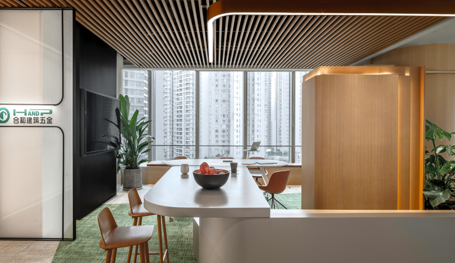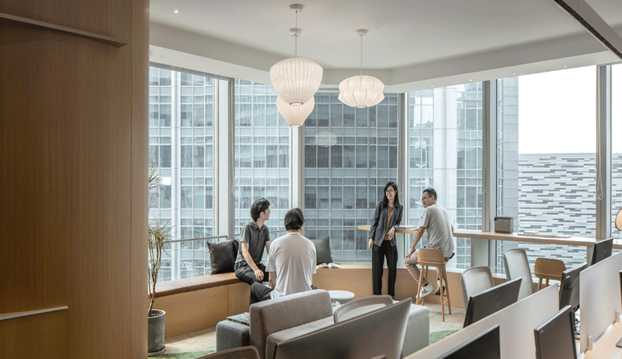 El diseño, basado en el concepto de «Sunshine Park», integra a la perfección elementos naturales con una cultura de colaboración abierta para crear un espacio de trabajo funcional y a la vez inspirador. Los techos de listones de madera generan una atmósfera cálida, mientras que la luz natural, la vegetación y las paletas de colores suaves superan la rigidez de las oficinas convencionales. El mobiliario de madera clara combinado con alfombras verdes fomenta un ambiente relajado y productivo. La vegetación interior evoca el paisaje urbano que se extiende más allá de las ventanas, creando un diálogo dinámico entre el interior y el exterior.