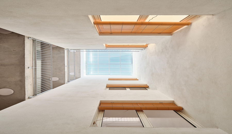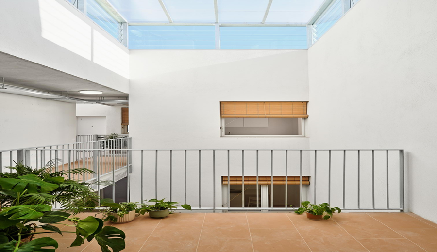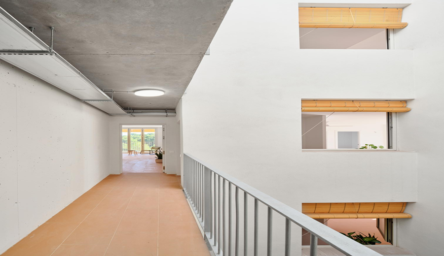 Los núcleos de circulación se conciben como espacios de alta calidad ambiental, gracias a la incorporación de cuatro patios concatenados que aportan luz natural y ventilación cruzada a los espacios comunes y a todas las viviendas. Estos patios transforman los ámbitos circulatorios en áreas semiexteriores que propician el encuentro vecinal y funcionan como reguladores térmicos pasivos. En conjunto, el proyecto adopta una estrategia integral de eficiencia energética pasiva, concentrando las instalaciones húmedas en torno a los patios para disminuir recorridos, consumo y complejidad técnica.