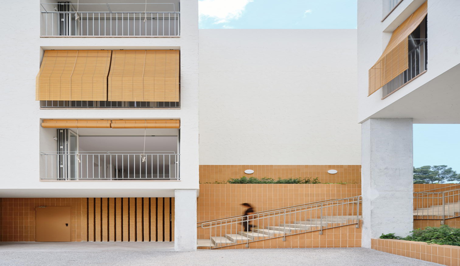 El proyecto residencial en Castelldefels fragmenta su volumetría para generar una mayor permeabilidad urbana y visual, favoreciendo la continuidad entre el tejido construido y el bosque de pino colindante. La compleja topografía del solar, con un desnivel de hasta 9 metros, se resuelve mediante un escalonamiento que adapta los edificios de viviendas sociales al terreno.