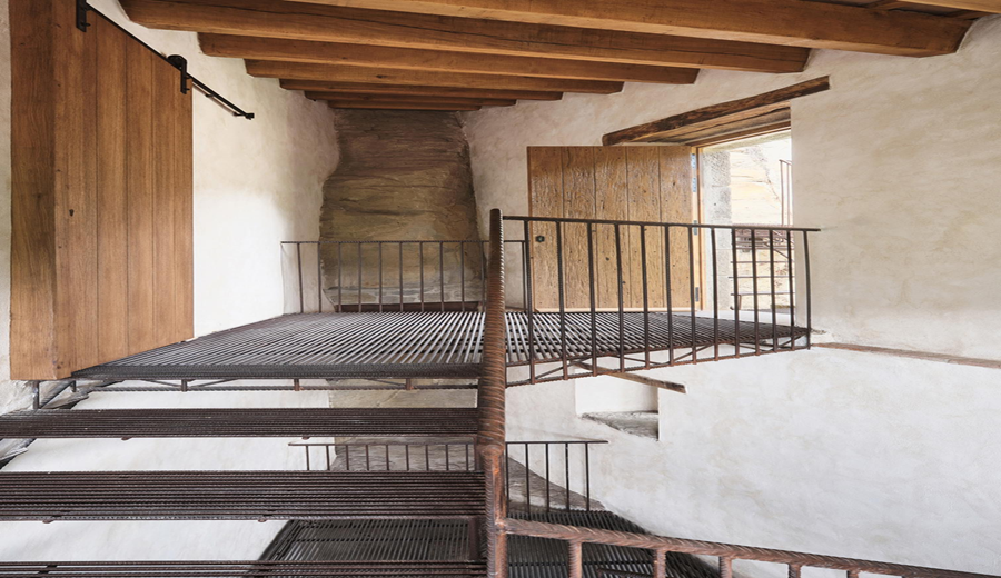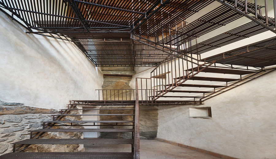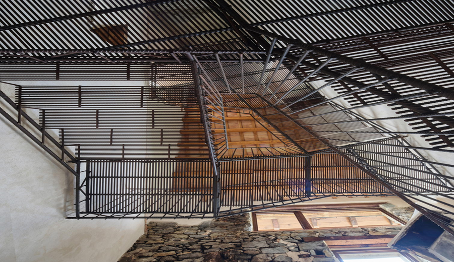 Desde el interior vaciado de la finca, una nueva escalera recupera las cotas originales y destaca elementos existentes, como la chimenea y la roca medianera. Una pasarela suspendida sobre la finca vecina conecta con el inicio de las escaleras históricas. Un tramo anclado directamente a la roca salva el siguiente desnivel y conduce a un camino situado tras las cubiertas colindantes. El recorrido finaliza con una última escalera que sigue la traza original y desemboca en una plataforma de observación ubicada dentro del perímetro de la antigua torre.