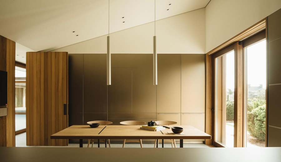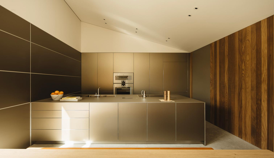 Los pasillos laterales conducen a las distintas estancias, y en las esquinas se disponen espacios complementarios como la cocina —en la cara norte—, el despacho y la sala de televisión —en la sur—. El diseño interior, desarrollado junto a Estudio Baufor, prolonga la coherencia material y formal del conjunto.