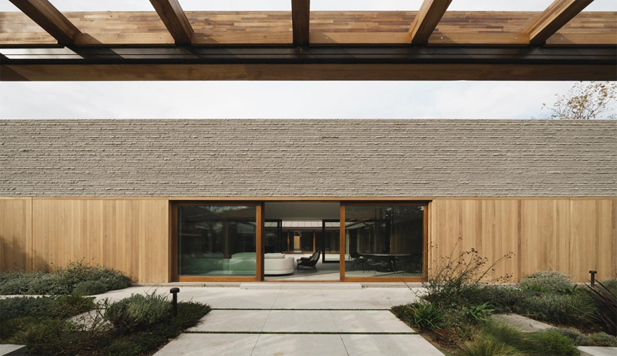 La fachada exterior, ejecutada en sillería de piedra caliza, muestra un aparejo minuciosamente trabajado y una textura escafilada realizada directamente en obra. Para subrayar el carácter abstracto del volumen, se eliminan cornisas y remates, acentuando la pureza de las aristas. Los huecos, resueltos con carpinterías de madera de iroko y paneles correderos del mismo material, introducen un contrapunto cálido frente a la solidez pétrea del conjunto.