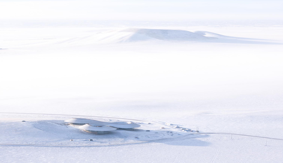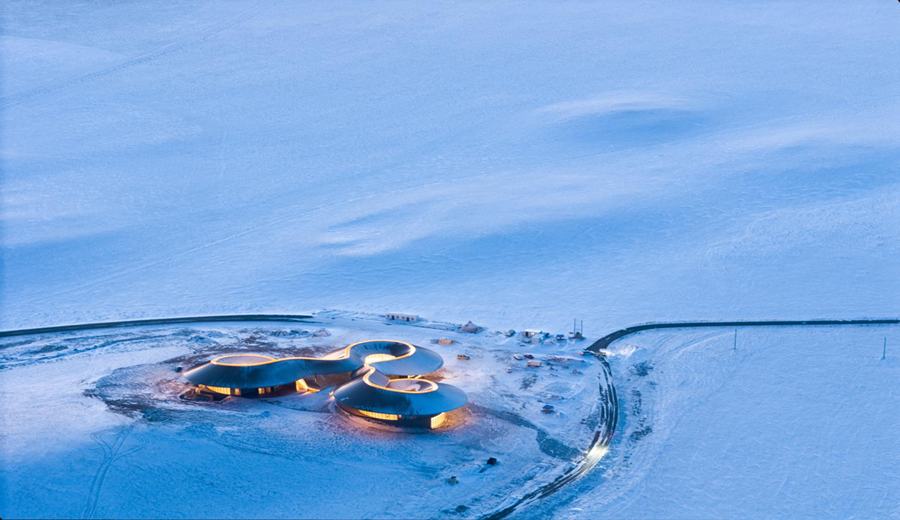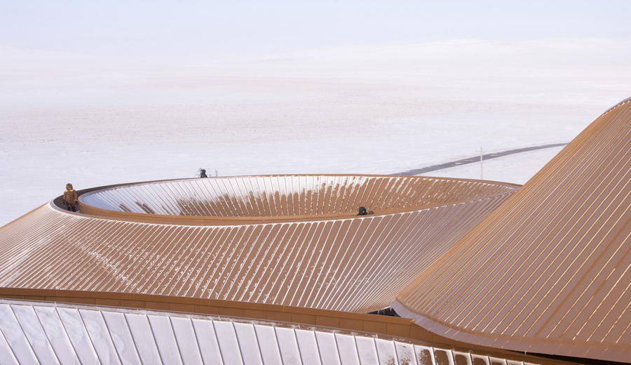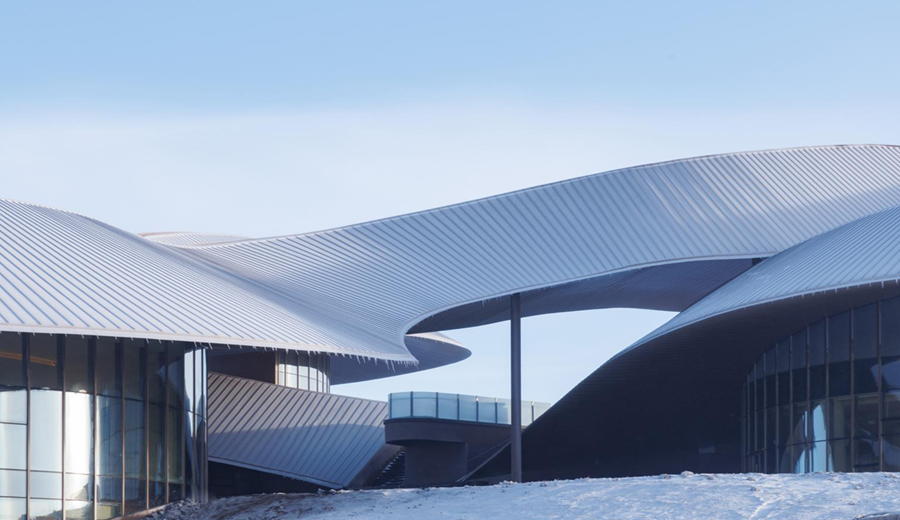 Las condiciones climáticas extremas de Baiyinkulun, con fuertes vientos, ventiscas y temperaturas que pueden descender hasta los -43 °C, influyen directamente en el proyecto. Las formas curvas reducen la presión del viento, mientras que los aleros prolongados protegen patios y accesos de la nieve. La envolvente incorpora paneles metálicos resistentes a la intemperie para mejorar el rendimiento térmico, y los muros cortina de vidrio reflejan el paisaje circundante. Siguiendo un principio de baja intervención, el paisajismo utiliza piedra volcánica y placas de acero resistente, reforzando la continuidad material entre el edificio y el terreno.