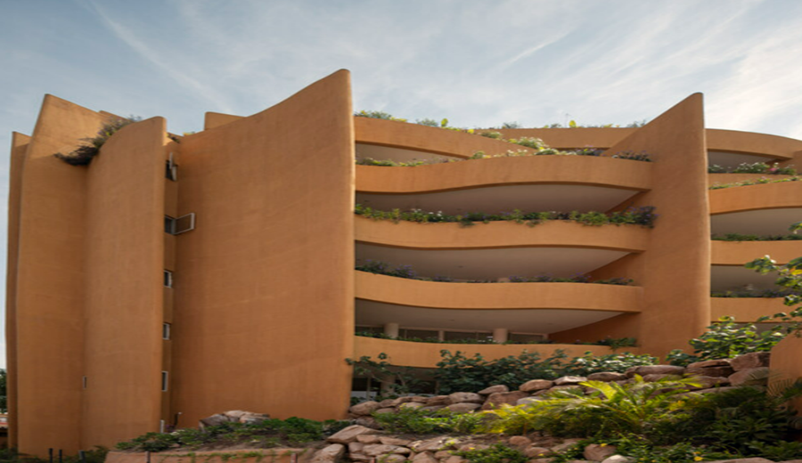 La fluidez formal del proyecto requería una compleja estructura mixta: losas de fundación escalonadas que se adaptan al relieve, muros de concreto reforzado curvados y columnas que, junto con vigas, forman marcos rígidos que soportan las losas superiores. Las terrazas se resuelven con vigas cóncavas y convexas que siguen el trazo orgánico de las jardineras, integrando barandas y vegetación en un solo gesto constructivo.