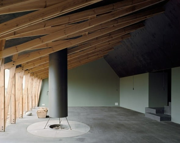 Las líneas de la cocina, el salón y el aseo siguen la misma inspiración que la del dormitorio, mientras que en la zona más amplia de la vivienda destaca una chimenea hundida en el suelo, ubicada en una sala de estar con vistas al exterior.
