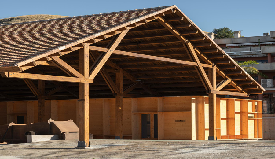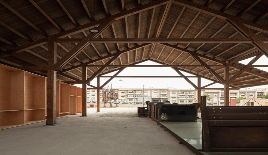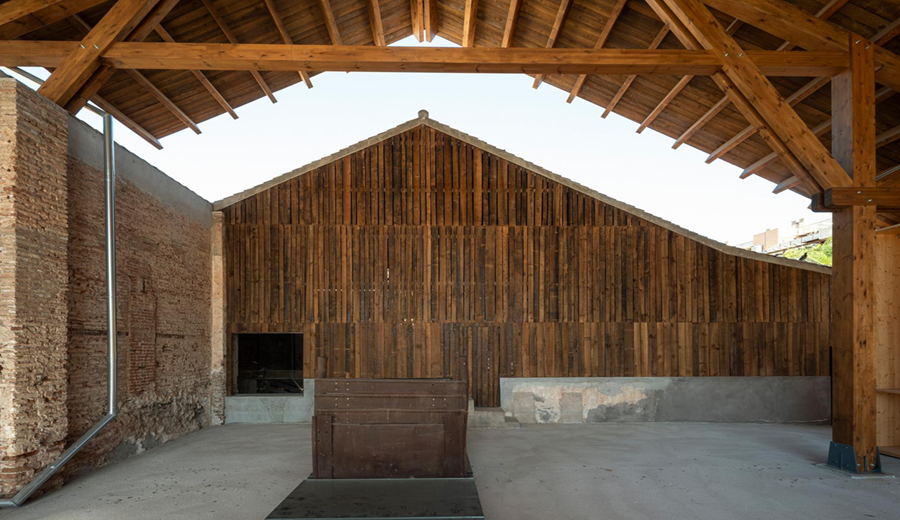 Finalmente, se incorporan tres nuevos elementos que organizan el acceso al conjunto: un patio de trabajo que conecta los dos niveles mediante escalera y elevador; un pabellón de divulgación cuyo cerramiento de tablero tricapa funciona como expositor de herramientas; y un gran umbráculo de madera laminada que articula y cubre estos espacios. Todo el proyecto apuesta por el reciclaje de materiales existentes, reutilizando maderas, tejas y tableros para dar coherencia, sostenibilidad y continuidad al conjunto.