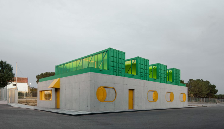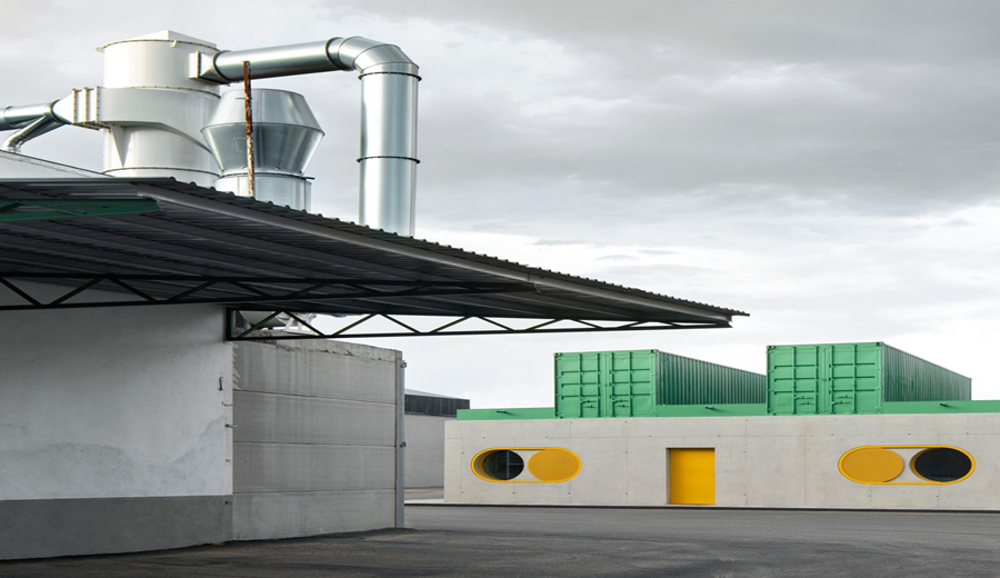 La organización espacial parte de un sistema sencillo y repetible. Cuatro contenedores marítimos reutilizados, abiertos en dos de sus lados, se apoyan sobre un zócalo de hormigón común a las naves industriales. Esta configuración genera una cubierta en forma de dientes de sierra que actúa como una serie de lucernarios, aporta una iluminación natural uniforme y potencia la calidad del espacio interior. La disposición hacia el norte de los planos abiertos asegura una entrada de luz continua y regulada.
