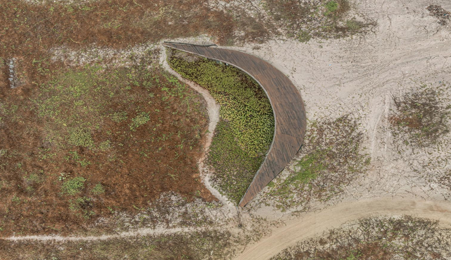 La edificación principal está inspirada en la abstracción formal de una duna de arena. Se concibe como una gran cubierta curva, elevada sobre el terreno, que genera espacios interiores protegidos para el desarrollo del programa. El uso predominante de la madera refuerza la relación con el entorno.