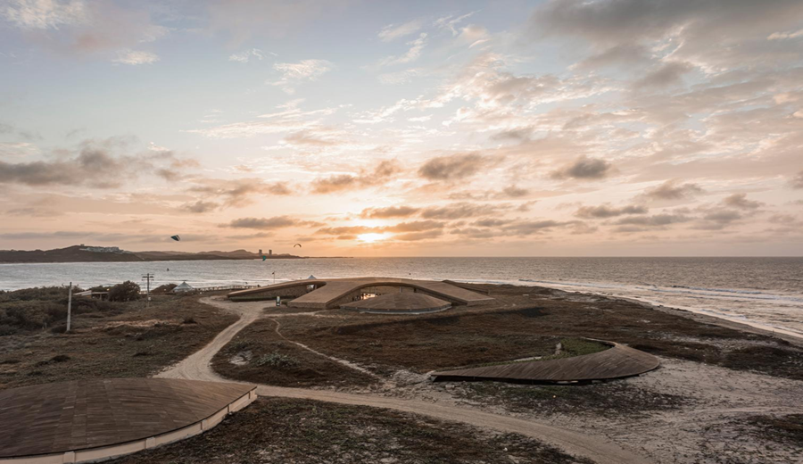 El conjunto se organiza a partir de dunas paisajísticas que cumplen una doble función: mitigar los fuertes vientos predominantes del noroeste y albergar actividades culturales y comerciales, especialmente vinculadas a la gastronomía local. Estas dunas incorporan senderos y vegetación propia del lugar, integrando arquitectura y paisaje de manera orgánica.